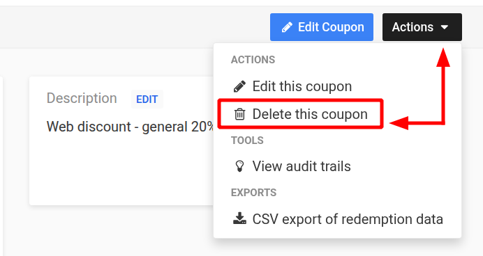 STEP 3: Go to the Actions menu in the top-right area and select "Delete this coupon."
